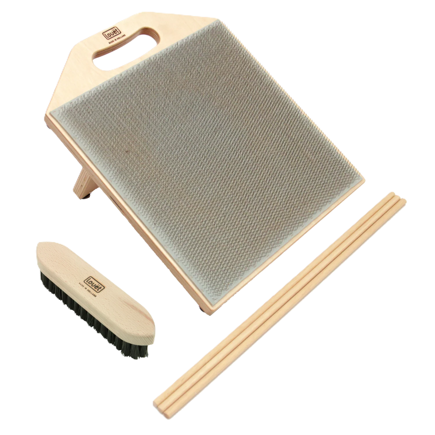 Louet’s new blending board as a fiber processing tool, allows you to produce rolags and batts. Blend colors and fibers for beautiful effects in your handspun yarn. It is made with Louet’s XL carder cloth. 30cm x 30cm (12″x12″) cloth size. Teeth are spaced at 72 teeth/sq inch. Teeth are 3/8″ deep (11 mm). Meant to blend fine to medium fibers. Made of lacquered laminated birch.